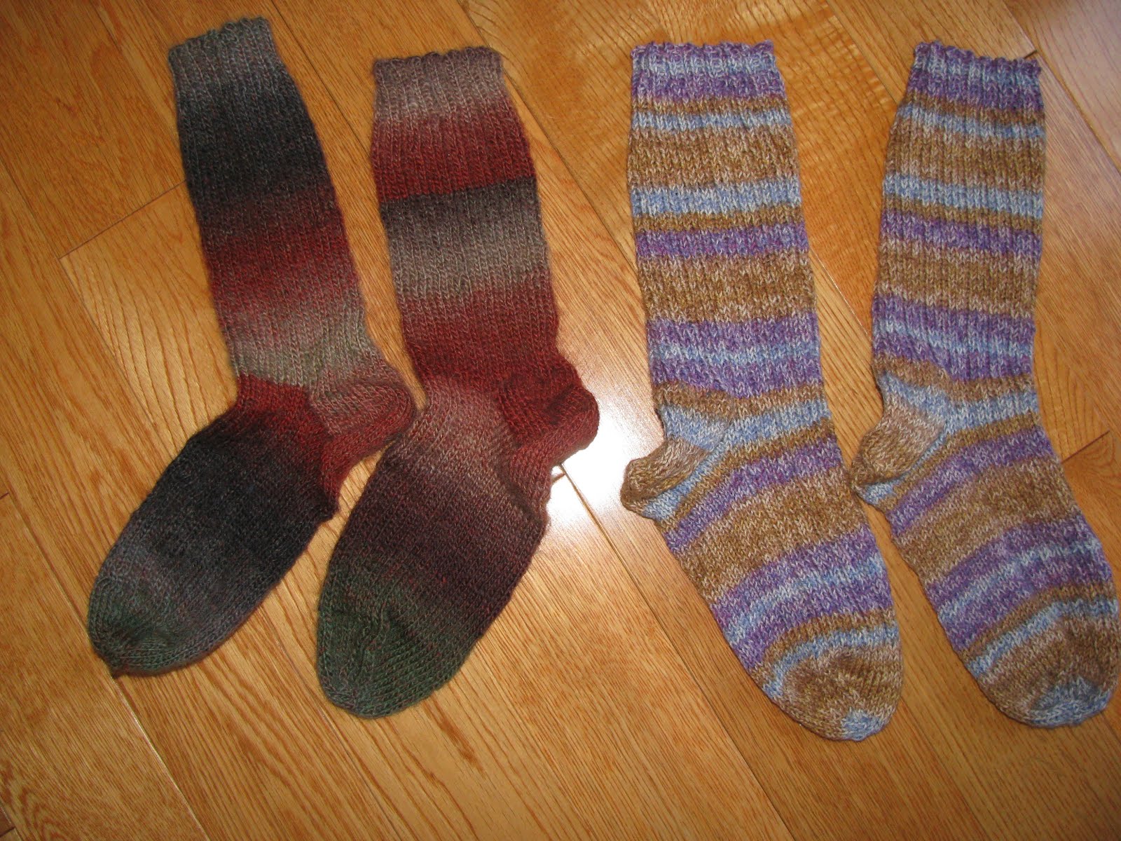 When I travel, I have to take knitting. There are so many times when you are sitting around waiting.... at the airport, now that we all have to be there hours before departure, and on the plane, waiting to GET there. Usually I take socks, because they take so little space in your carry-on, and you don't end up poking your neighbours in the oh so skinny seats on the plane. Full size needles are too long for today's planes (unless you indulge in first class seats!) I had the striped socks almost done (just the toe of the second left to do), so I finished those really quick, and started the second random died green socks on the way down. I finished the last of the greenies the afternoon after I arrived home, while I caught up on my DVR'd Coronation Street episodes!