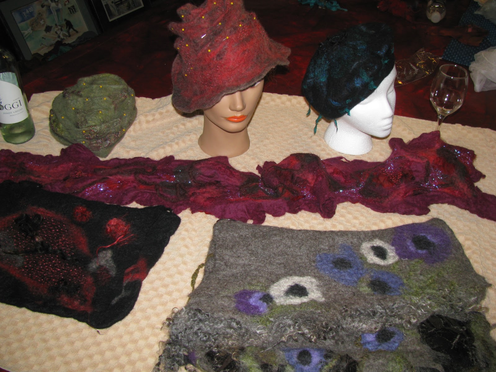 I hosted a felting workshop today. The goal was to work with resists. Six ladies attended, and three wanted to make hats, two to make bags, and one (a beginner) asked for a simple scarf. Here is the photo of the projects.